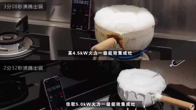 佳歌集成灶加熱的牛奶在2分32秒已經沸騰出鍋,而另一集成灶則需要3分08秒。即便是與4.5kW火力一級能效灶具相比,佳歌集成灶加熱速度也提升了20%以上。