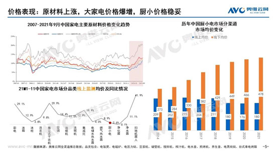 2021年討論熱點之一必然有持續增長19個月的大宗原材料價格,原材料價格的上漲對各行各業包括廚房小家電行業都帶來一定的影響。但是從數據層面展現來看,小家電整體均價無論線上還是線下漲幅都不大,相對保守。核心原因來自各品類本身市場需求的疲弱,品牌不敢大幅漲價,其次是頭部品牌之間的“博弈”,都對小家電均價上調有一定的影響。但是從分月節奏上來看,后半年以來小家電均價開始增幅有所提升,預計明年在頭部品牌庫存壓力加劇的情況下迎來均價上調。