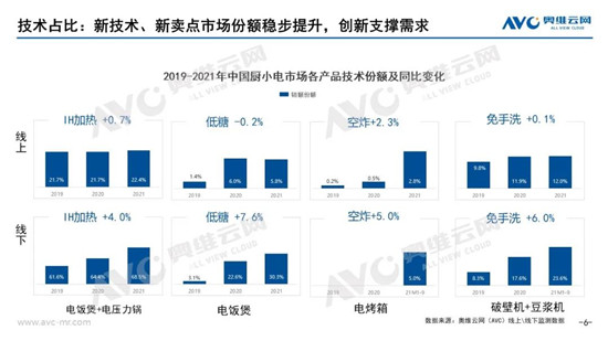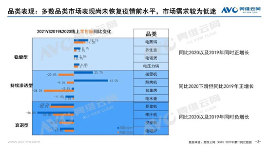 自2021年以來,小家電領域廚房烹飪小家電持續承壓,源自廚房小家電行業本身市場周期臨近成熟,加之2020年新冠疫情影響下,宅經濟帶動的火爆銷售促使廚房小家電行業快速透支,2021年的負增長成為必然。但是,線下市場恢復情況過度不近人意,目前來看基本已無翻身之力,企業亟待探索線上線下融合的更優道路。