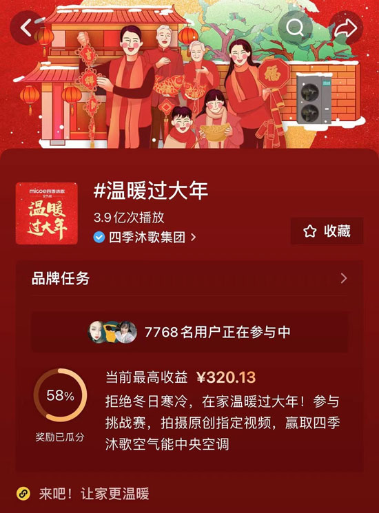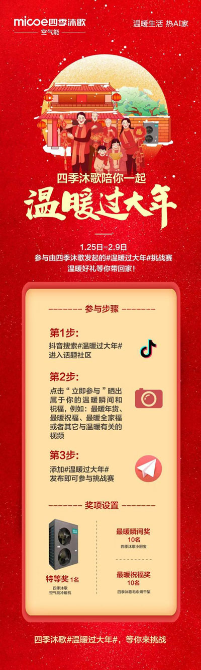 這個春節,無懼嚴寒,四季沐歌帶你感受四季如春的溫暖,用創新科技將溫暖傳遞給千家萬戶。而在這喜慶暖心的闔家團圓里,四季沐歌同樣希望把這份“溫暖”帶給大家。為此,四季沐歌特別發起#溫暖過大年#抖音區域挑戰賽活動,只要你在活動期間拿起手機打開抖音,參與#溫暖過大年#挑戰賽話題,點擊“立即參與”并曬出屬于你的溫暖瞬間與祝福,如“最暖年貨”、“最暖祝!钡,最后添加#溫暖過大年#,簡單幾步即可成功參與挑戰,和全民一起來PK。