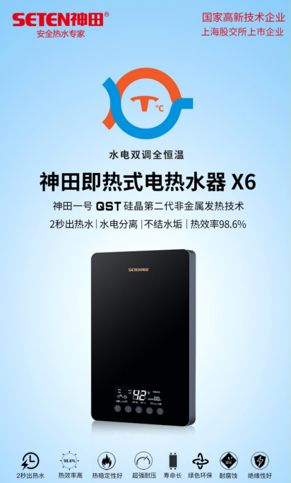 神田在即熱式電熱水器品類中擁有專利技術——神田一號QST硅晶第二代非金屬發熱技術。