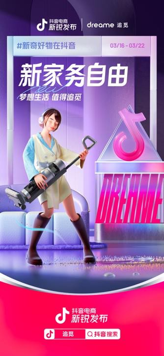 如何使新品觸達更廣闊的消費者群體?對于此,追覓科技聯手“抖音電商新銳發布”IP,借勢新品發布,以“解決家務焦慮,實現新家務自由”為主旨,通過聚合多方資源、定向運營、扶持,帶動了品牌全維增長。