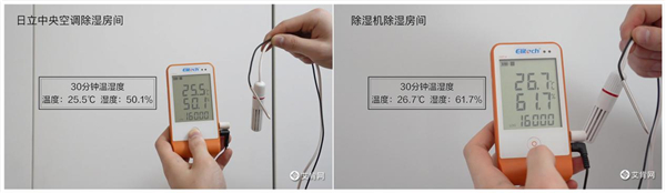 廣州地區雨后空氣濕度可達100%,一場“比拼”就在這里進行。一沿江小區的兩個同樣的房間內,分別放置除濕機與日立中央空調,測得初始濕度為78.8%和76.8%,測試正式開始。運行30分鐘后,日立溫濕雙控內機就已經達到了設定濕度值50%,而擺放除濕機的房間內,一個小時測得室內濕度仍然為60.7%。