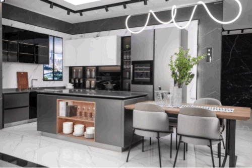 門板打破傳統純色,大膽啟用紋理藝術,神秘莫測的暗夜灰,溫柔浪漫的月光白,打造靜謐優雅的廚房空間。