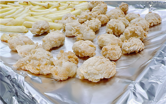 將薯條、雞米花等冷凍的半成品放入烤籃中?諝庹J,200℃,15min。這個炸籃是9YC03蒸烤炸款集成灶自帶的,雙明透氣能夠讓食材會更加酥脆,還不用翻面。
