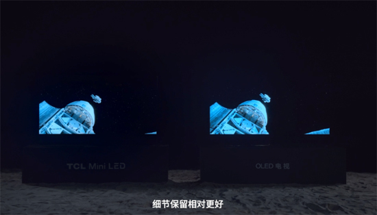 播放暗場畫面,是測試電視顯示效果的“照妖鏡”。在午夜海灘播放暗場星空畫面和大片夜晚劇情片段時,得益于MiniLED分區控光技術,TCLQ10G暗部畫面效果相比OLED毫不遜色,沒有出現暗角和光暈問題;亮部畫面,TCLQ10G細節保留較好,顏色更艷麗,飽和度更高,色彩更加自然真實。此輪TCLQ10G小勝。
