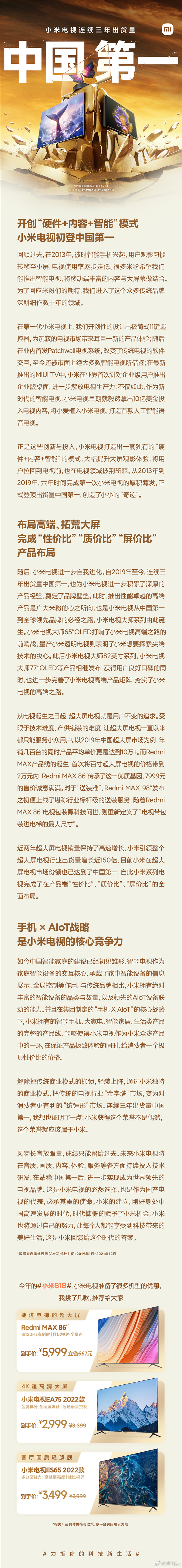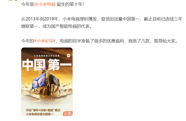 小米集團合伙人,中國區、國際部總裁盧偉冰在微博宣布,今年是小米電視誕生的第十年,從2013年到2019年,小米電視登頂出貨量中國第一,截止目前已連續三年蟬聯第一,成為國產智能電視的代表。