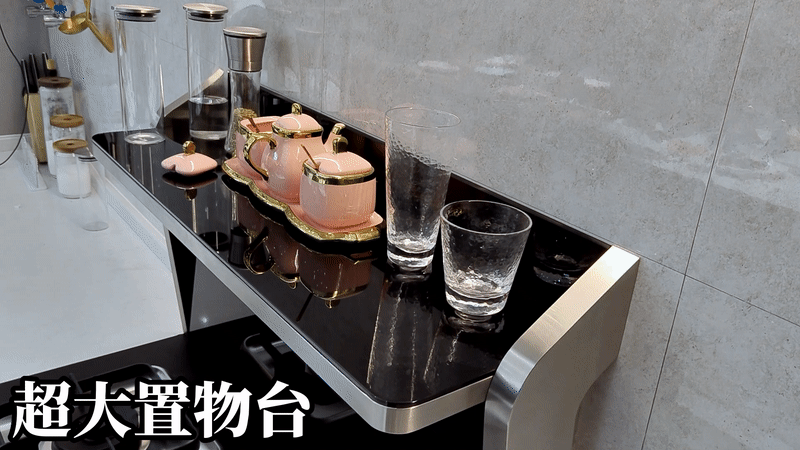 煙機上方延伸出寬大的置物平臺,隨手取放調味料和碗碟很方便。臺面邊緣做了圓弧設計,能防止磕碰受傷。