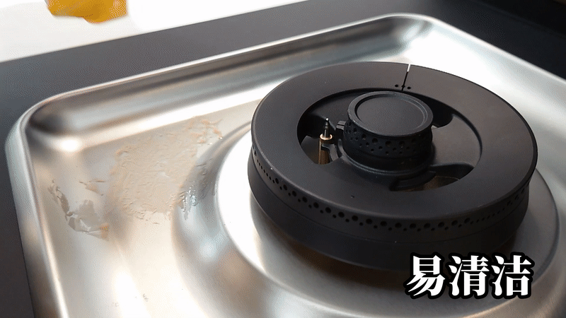 灶具下方設計有寬大積水盤,溢鍋時也不用擔心湯汁流出臺面,清潔打理很方便。灶臺上采用了帶防爆膜的黑色磨砂玻璃,比起常見的亮面玻璃更易打理。