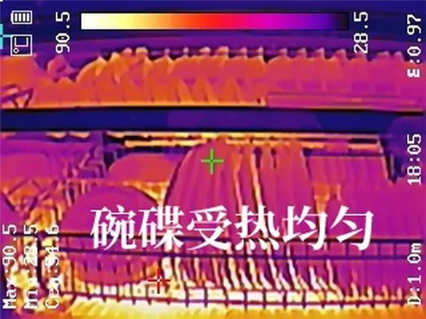 消毒完成后,我們使用熱成像儀檢測箱內溫度,可見餐具受熱很均勻,內部最高溫度有90.5℃,碗碟表面溫度為54.6℃,考慮到新風烘干系統已自動開啟5分鐘,熱量有所流失,因此碗碟溫度會低于標稱的65℃。