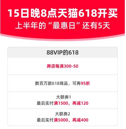 上半年的“最惠日”還有5天,把心愛之物以超值價格收入囊中,“大鵝券”依然是最關鍵的那把鑰匙。14日零時起,天貓再次發放520元專屬大額券。今年88VIP的618滿減權益,除了可跨店每滿300減50外,還能再享部分商品95折,以及在訂單最終實付滿1500元、5000元情況下分別再減120元、400元。