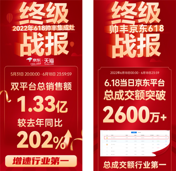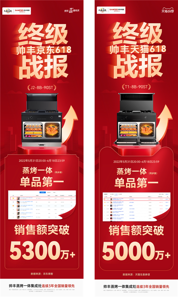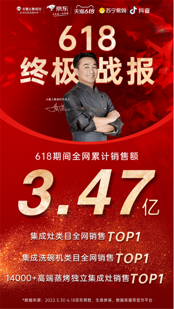 據品牌開門紅排行榜(集成灶品類)顯示,5月31日20時-6月1日24時,億田首日金額排名榮登TOP1,贏得618開門紅。據京東后臺數據顯示,5月31日20時—6月18日24時,在京東家電競速榜(蒸烤一體集成灶)中,億田集成灶高居榜首,并獨占4席,為行業最多。