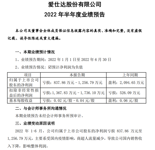 愛仕達發布2022年半年度業績預告,報告期內歸屬于上市公司股東的凈利潤虧損837.86萬元–1,256.79萬元,較上年同期由盈轉虧,同比變動-160.00%至-140.00%。主要系受國內疫情影響,商超人流量減少,導致公司國內銷售收入下降,影響整體利潤。