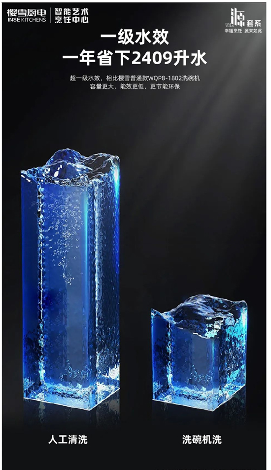 如今,在綠色低碳消費的大背景下,便捷化、節能化成洗碗機產品的升級新風向。櫻雪洗碗機2302比手洗更干凈節能,符合一級水效認證,一年可省2409L水,高效和省水一舉兩得。