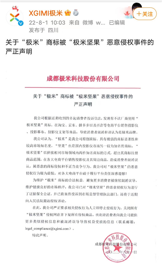 在8月1日,極米在官方微博上發布:關于“極米”上邊被“極米堅果”惡意侵權事件的嚴正聲明。