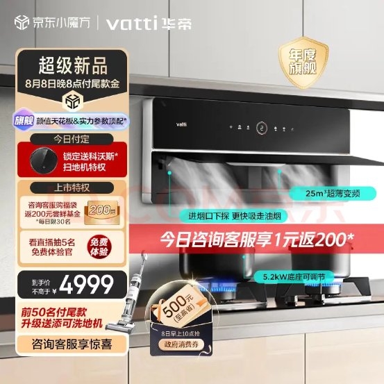 8月8日晚8點,華帝超薄近吸雙腔油煙機將在京東家電全面開售。8日19點30分前交定金20元可抵620元,相當于到手價4999元,一次搞定煙機灶具,而且首發期間,單單均送科沃斯掃地機。此外,京東家電還支持24期免息分期,更贈送365天只換不修服務。開售福利多多,大家速來京東家電搶購!