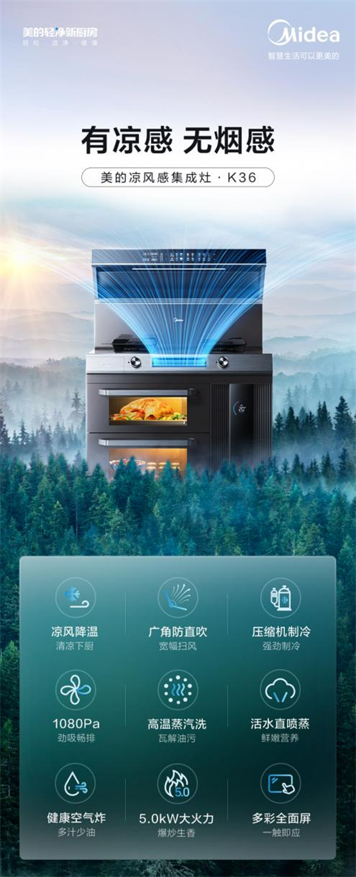 除此之外,美的涼風感集成灶K36還集高溫蒸汽洗技術、上蒸下烤技術、5.0kW大火力、多彩全面屏設計等優勢于一身,為夏日廚房增添些許愜意。