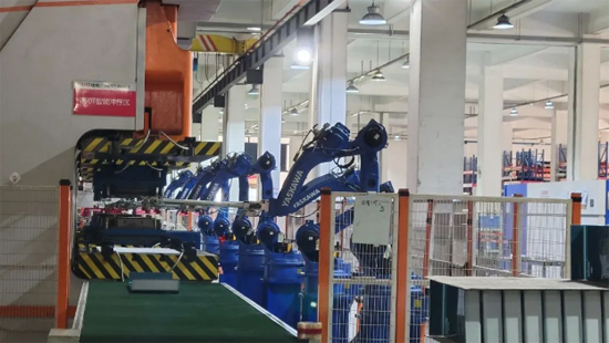 旁邊是110噸八連壓力機自動生產線:由八臺110噸揚力液壓機、9臺安川機械手和一臺自動上料裝置構成。