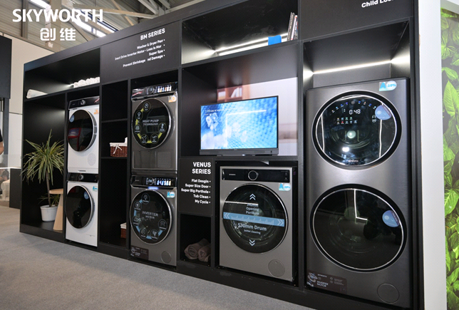 創維滾筒洗衣機產銷規模穩居中國前三。展出產品配備彩色觸控屏,容量覆蓋6至12公斤,提供母嬰護理、快洗、輕柔等多種洗滌模式,并具備UV除菌、高溫殺菌、筒自潔等智能功能,全面覆蓋不同用戶需求。其中40cm超薄洗衣機尤其受到歐洲市場歡迎,成為當季熱銷產品。