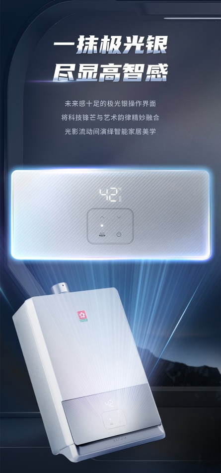 從外觀來看,該產品整體采用極光銀配色,操作界面富有金屬光澤感,光影流動間,科技鋒芒與藝術韻律悄然融合,既不張揚,又能在現代簡約、輕奢等多種家居風格中自然融入。更令人驚喜的是它的“身材”,555×360×150mm的纖薄機身,比常規熱水器節省安裝空間,即使是安裝在小戶型衛浴的墻面,也像一件精致的科技藝術品。
