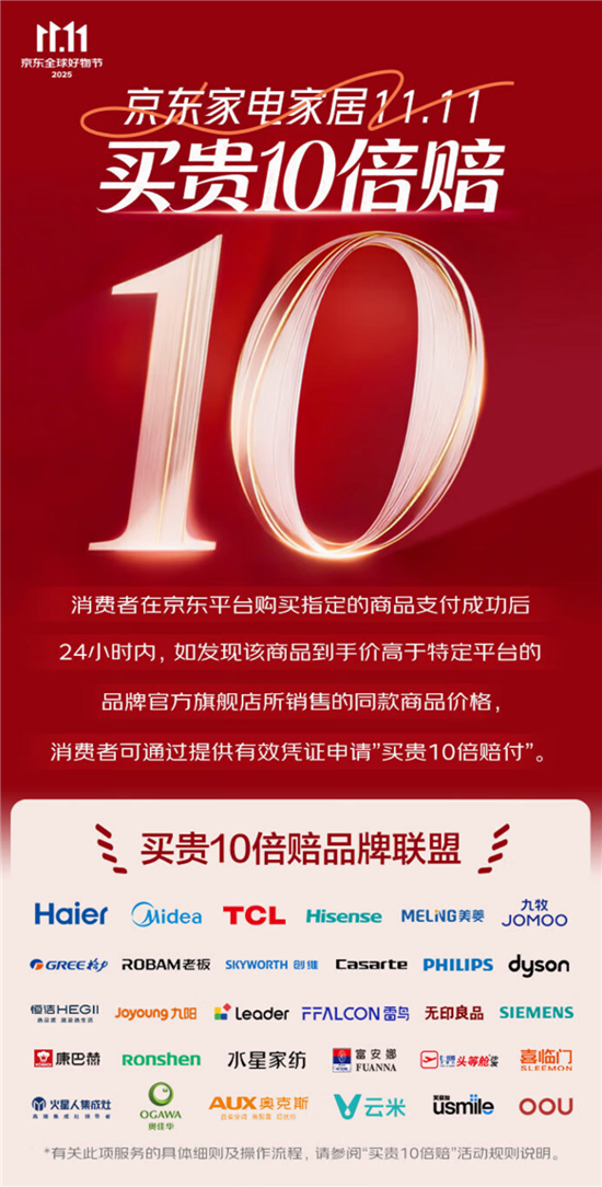 此外,京東貼心安排了“買貴10倍賠”保障:10月14日20點至11月11日24點,購買帶“買貴10倍賠”標識的商品,如發現價格高于指定平臺同款,可在京東APP“我的訂單—訂單詳情”聯系客服提交資料,經審核通過后按1:100比例返還京豆。打開京東APP,搜索“買貴10倍賠”,即可輕松參與。