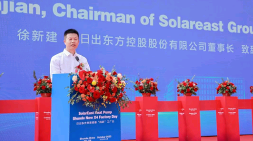 活動伊始,日出東方董事長徐新建登臺致辭,向蒞臨現場的領導、來自全球各地的客戶、供應商及企業員工表達歡迎與感謝。他表示,“四新”工廠建設的最終目的,是打造具有國際競爭力的產品,兌現對客戶的承諾。徐董還介紹了企業在清潔能源領域的布局:已構建從光熱、熱泵、儲能到光伏直驅電氣技術的完整零碳能源應用能力,同時,公司也已經形成覆蓋零碳家庭、零碳建筑、零碳園區的系統化解決方案綜合能力。期待通過這種能力,為全球客戶提供更優質的支持。