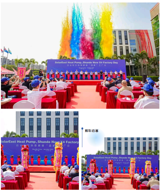 活動現場,剪彩儀式隆重舉行。政府領導、日出東方董事長徐新建,多國客戶代表、供應商代表及公司高管共同登臺,手持金剪齊力剪斷象征新起點、新希望的彩帶。剎那間,彩煙飛揚,舞獅騰躍助興、祥氣滿盈,四季沐歌空氣能熱泵順德“四新”工廠正式啟用,以全新姿態開啟高質量發展新篇章!