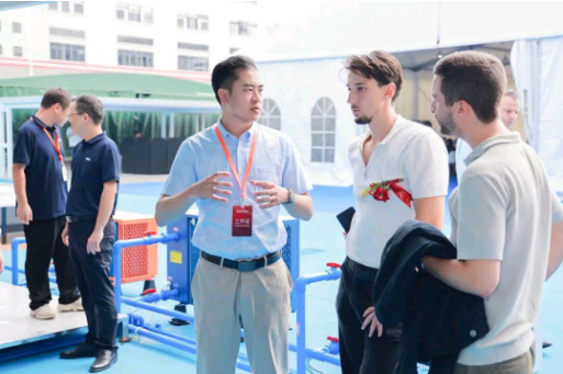 嘉賓們齊聚泳池熱泵廣場,在技術人員的引導下實地觀摩產品運行實況。動態數據屏實時展示著熱泵系統的能效表現,嘉賓們或駐足細觀設備構造,或通過移動端查看遠程監控數據,親身感受熱泵技術的創新突破。