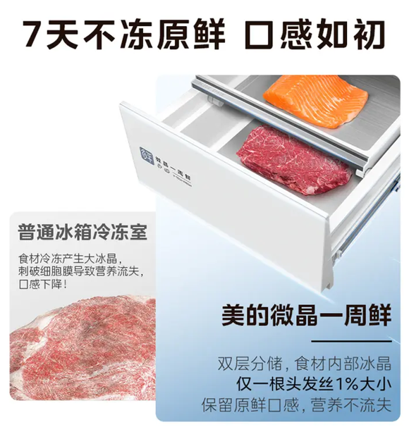 同時,美的冰箱首創的 “微晶一周鮮” 技術,能夠做到7 天鎖住肉類原鮮口感,真正做到“一周更鮮活”,達到國際領先水平的1級口感保鮮標準。從空間到凈化,從保鮮到功能,美的熊墩墩以技術創新和選配方案,為用戶帶來可定制化新選擇。